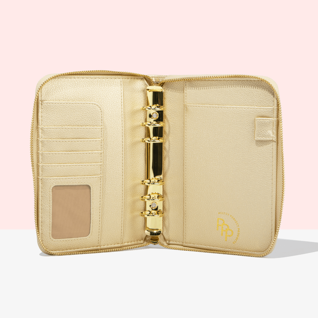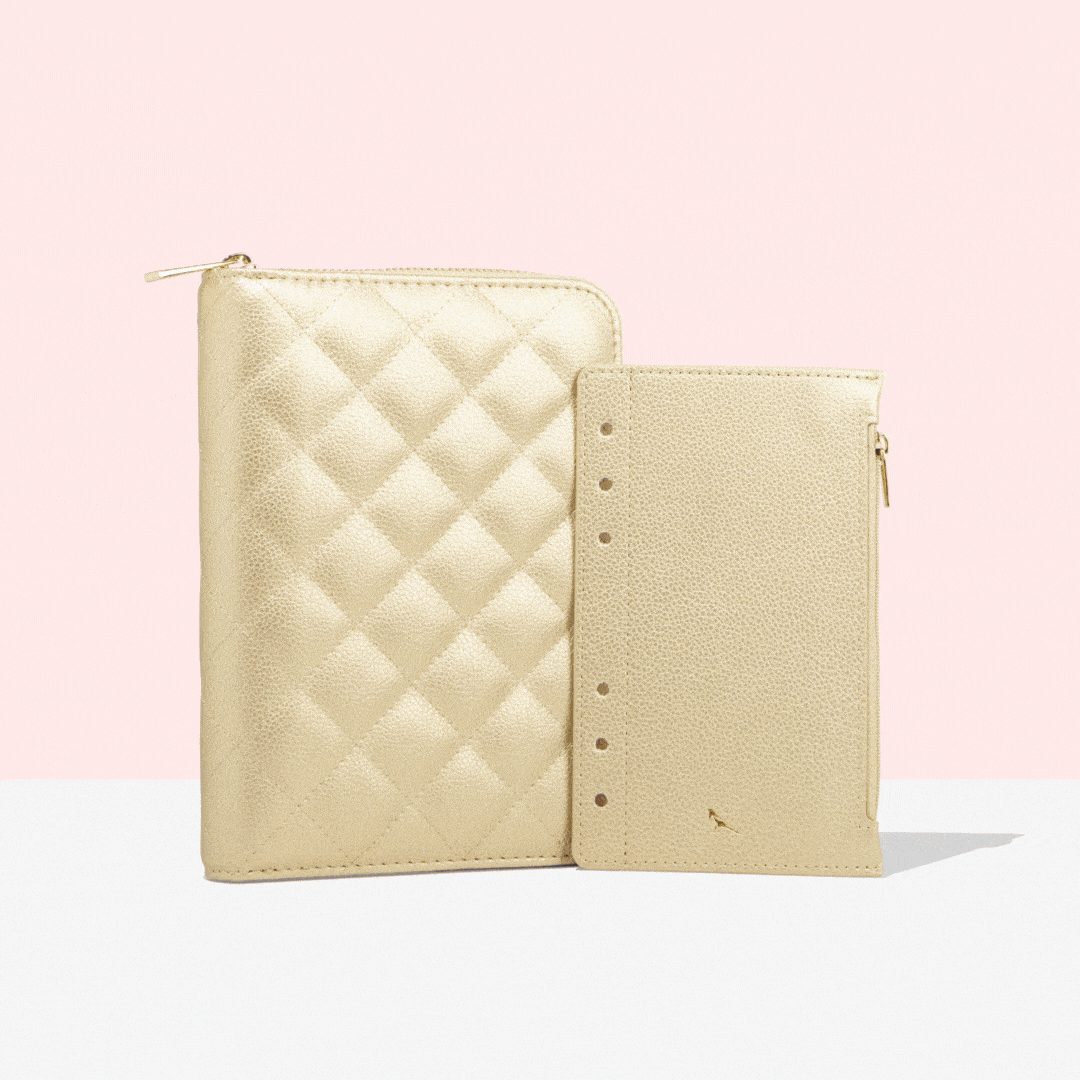 It fits perfectly inside your bag and comes with 5 card holder slots, 2 full size and 2 smaller slots for your notes or receipts and a pen holder. All hardware is in a lovely gold tone and the budget binder itself is made from a high quality, quilted faux leather and then finished with a gold zip fastening.
